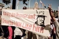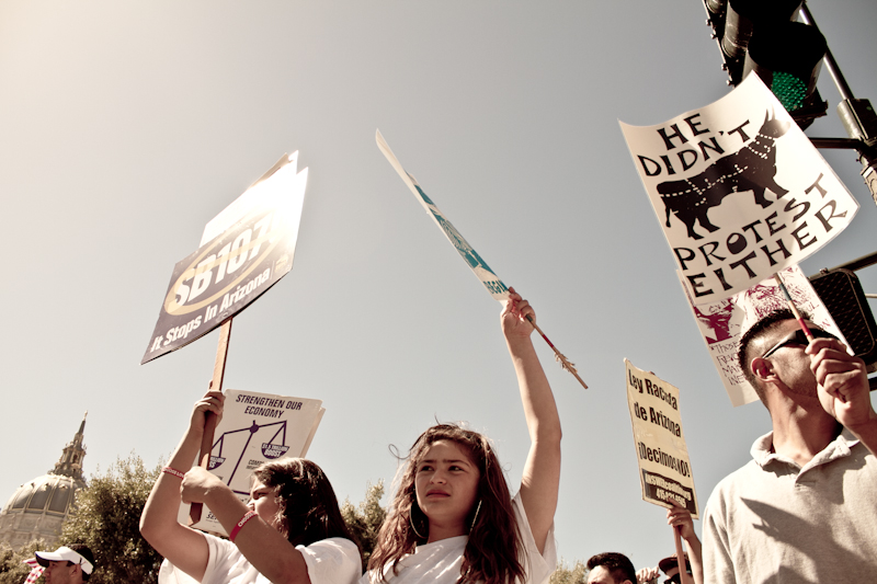 As a response to Arizona Senate Bill 1070, San Franciscans took to the streets on May Day (May 1st, 2010) to simultaneously celebrate the international day of workers' solidarity, and call attention to the harsh anti-immigration standards proposed by Arizona. Hundreds marched through the street to call attention to ongoing labor and immigration struggles suffered by the lower working class.